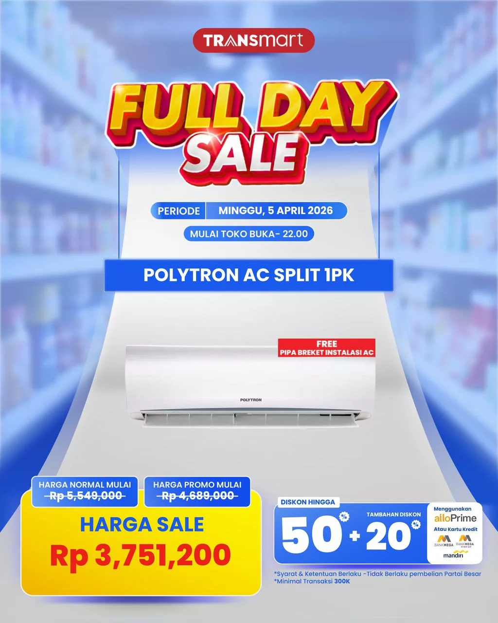 Dans cette promotion, Transmart offre une remise très importante. L’unité AC Split 1 PK de Polytron, qui était initialement au prix régulier de 5 549 000 IDR, a maintenant été réduite à un prix promotionnel de 4 689 000 IDR. Cependant, les surprises ne s’arrêtent pas là pour les détenteurs de la carte membre Transmart.